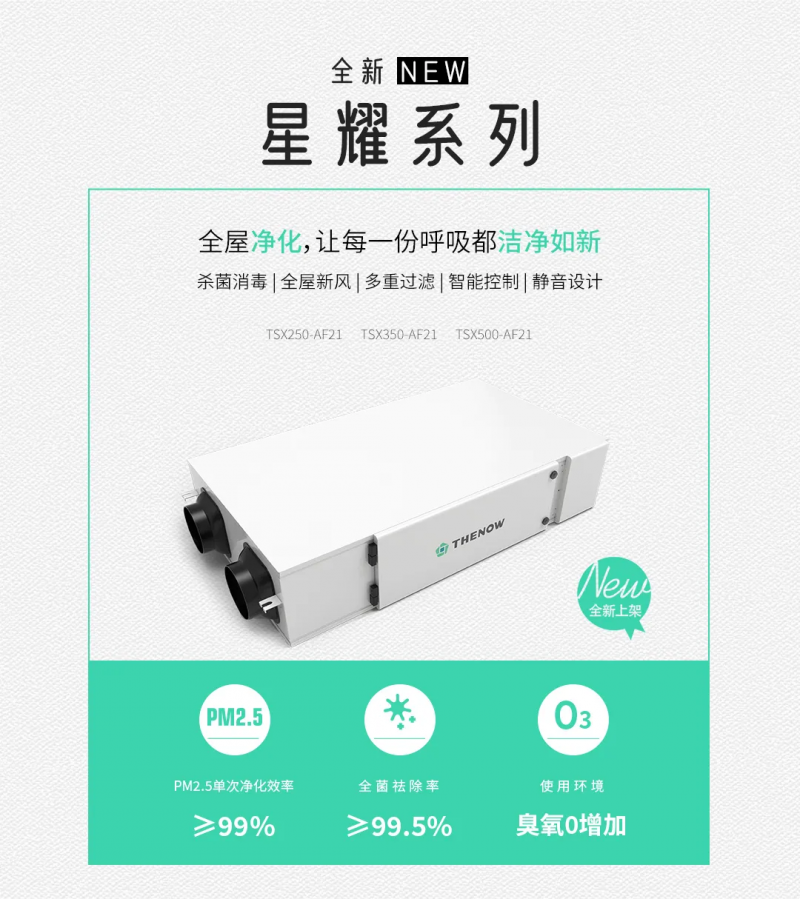 星耀系列—更高端的凈電滅菌產品 士諾新風星耀系列,讓每一個家庭都能全屋凈化,讓每一份呼吸都潔凈如新。士諾新風星耀系列采用Pure ESP凈電滅菌過濾技術,能夠在補充新鮮有氧空氣的同時,做到祛除霧霾、殺滅細菌、分解VOC、臭氧負增加、恒溫恒濕等功效,并且凈電模塊只需水洗無須更換,做到低成本享受舒適生活。產品特點:殺菌消毒、全屋新風、多重過濾、智能控制、靜音設計!